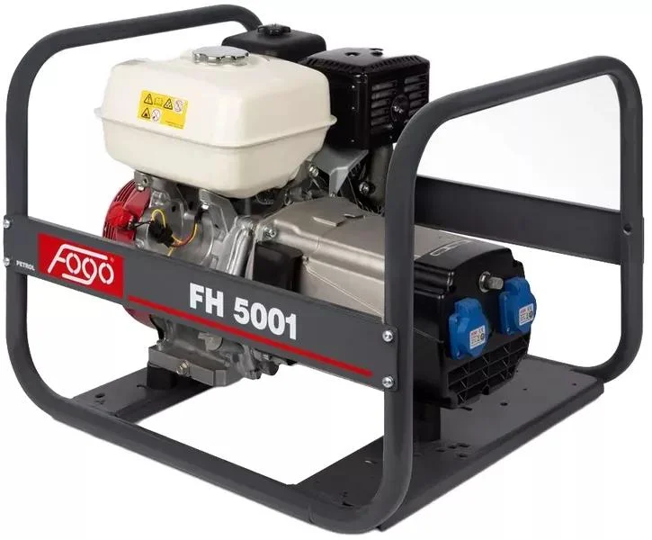 Wynajem agregatu prądotwórczego FOGO FG 5001 Przenośny agregat prądotwórczy o mocy 4,2 kW, wyposażony w niezawodny silnik Honda. Jest idealnym rozwiązaniem do użytku domowego, warsztatowego i na placach budowy, zapewniając stabilne zasilanie w trudnych warunkach.FOGO FH 5001 jest niezawodnym urządzeniem wyposażonym w silnik Honda GX270 oraz mechanizm regulujący napięcie. Agregat wyposażony jest w dwa gniazda 230 V 16 A, zabezpieczenie przeciążeniowe oraz czujnik poziomu oleju. Dzięki kompaktowym wymiarom i solidnej konstrukcji jest łatwy w transporcie i odporny na trudne warunki pracy. Specyfikacja: – Moc maksymalna: 4,2 kW– Moc znamionowa: 3,8 kW– Zużycie paliwa przy 75% mocy: 2,2 l/h– Napięcie znamionowe: 230 V 50 Hz– Prąd znamionowy: 16,5 A 1~– Waga netto: 53 kg