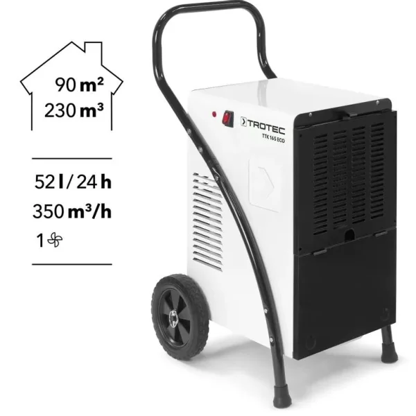 Osuszacz powietrza TTK 165 ECO52l/24h Wydajność osuszania max.90m² / 230m³ Rozmiar pomieszczenia do5l Zbiornik na wodęWażniejsze parametry osuszacza TTK 165 ECO:Przyłącze do przewodu odpływowego do osuszania permanentnegoŁatwy dostęp do filtraWyjątkowy mobilny dzięki rolkom transportowym i uchwytowiBardzo ekonomiczne rozwiązanie osuszania typowe dla obszaru przemysłowegoWysoka wydajność osuszania także w niskich temperaturachWytrzymała konstrukcja ze staliTransport i składowanie możliwe w każdej pozycji dzięki sprężarce z tłokiem obrotowym